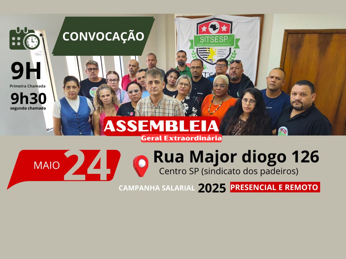 O SITSESP convoca todos os servidores da Fundação CASA para participarem da Assembleia Geral Extraordinária da Campanha Salarial 2025, que será realizada no dia 24 de maio de 2025, às 9h (1ª chamada) e 9h30 (2ª chamada).