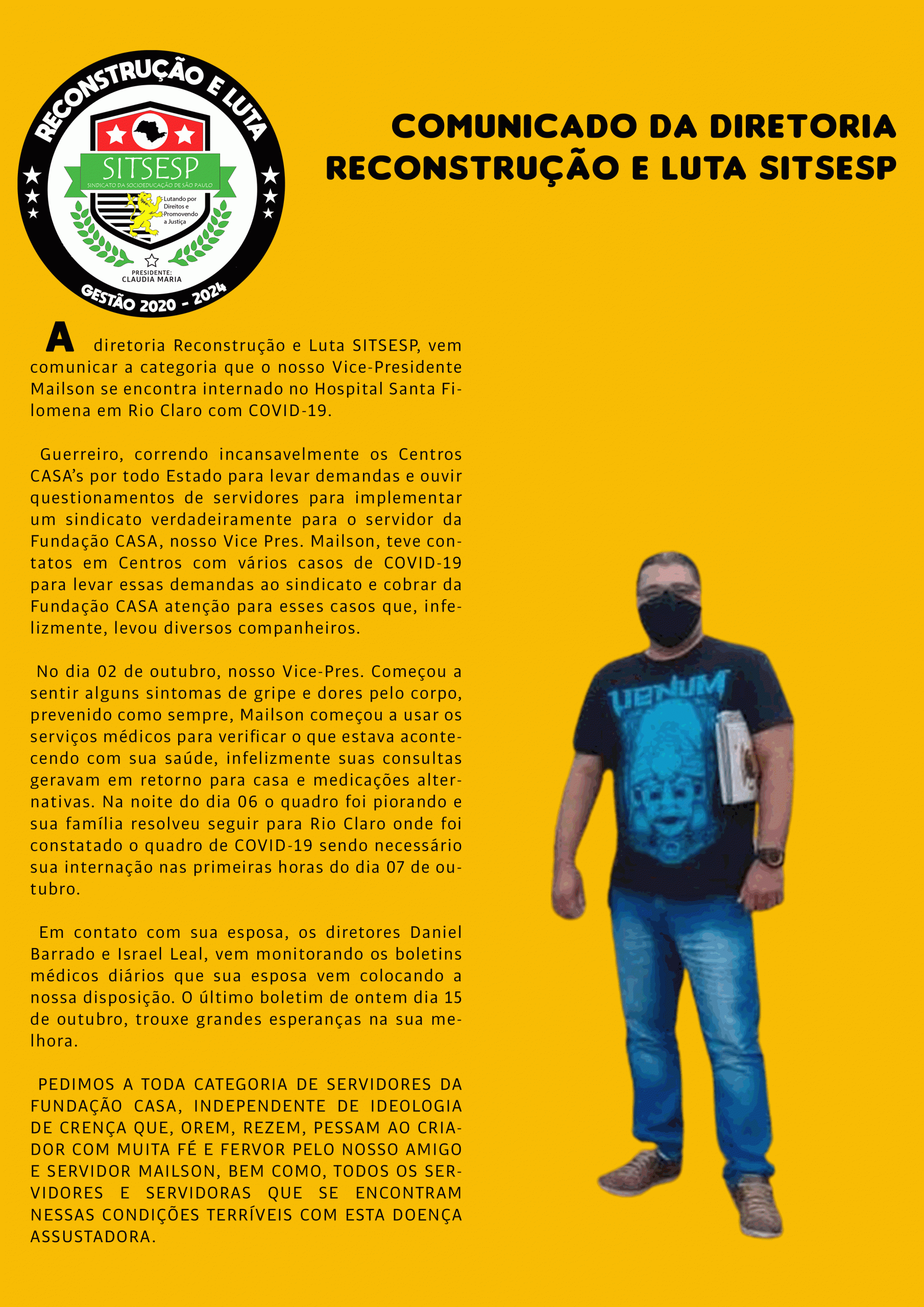 A diretoria Reconstrução e Luta SITSESP, vem comunicar a categoria que o nosso Vice-Presidente Mailson se encontra internado no Hospital Santa Filomena em Rio Claro com COVID-19.