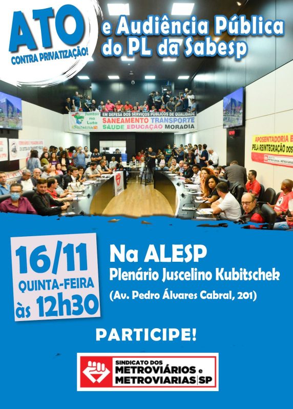 O SITSESP e o Sindicato dos Metroviários e Metroviárias convocam os trabalhadores da Fundação CASA que tiverem disponibilidade e possibilidade de estarem presentes para ato contra a privatização da Sabesp.