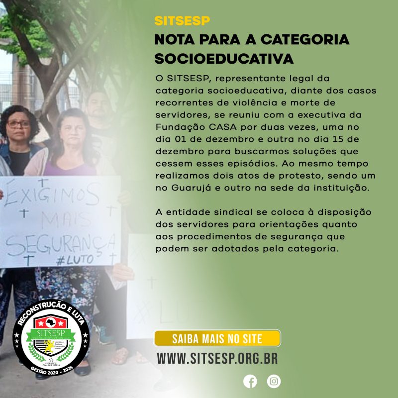 O SITSESP, representante legal da categoria socioeducativa, diante dos casos recorrentes de violência e morte de servidores, se reuniu com a executiva da Fundação CASA por duas vezes, uma no dia 01 de dezembro e outra no dia 15 de dezembro para buscarmos soluções que cessem esses episódios. Ao mesmo tempo realizamos dois atos de protesto, sendo um no Guarujá e outro na sede da instituição.