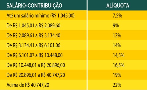 As faixas de contribuição ao INSS para os trabalhadores vinculados ao Regime Geral da Previdência Social começam em 7,5%, para quem ganha o piso e vai até 14% sobre o teto de R$ 6.101,06.